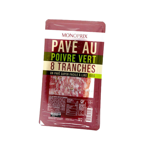 Elevate your appetizer platter, sandwich, or simple snack with the rich, savory taste of our Pavé au Poivre Vert (Green Peppercorn Pave). Crafted with care, this deli classic features tender, perfectly seasoned meat, generously coated with fragrant, mildly spicy whole green peppercorns.